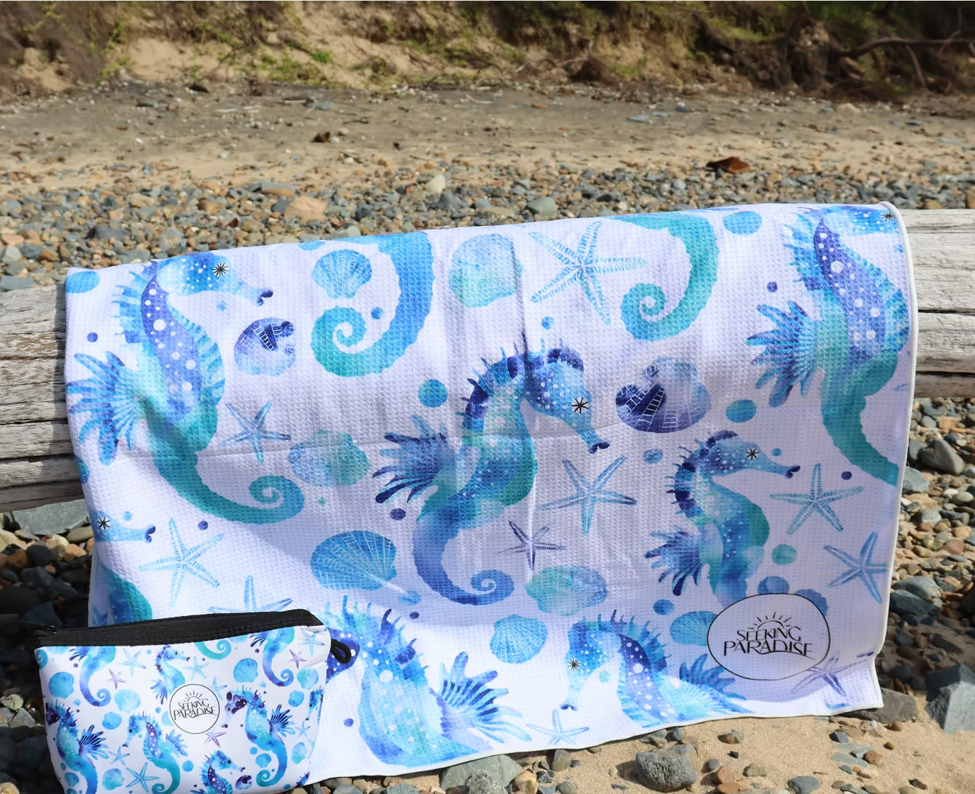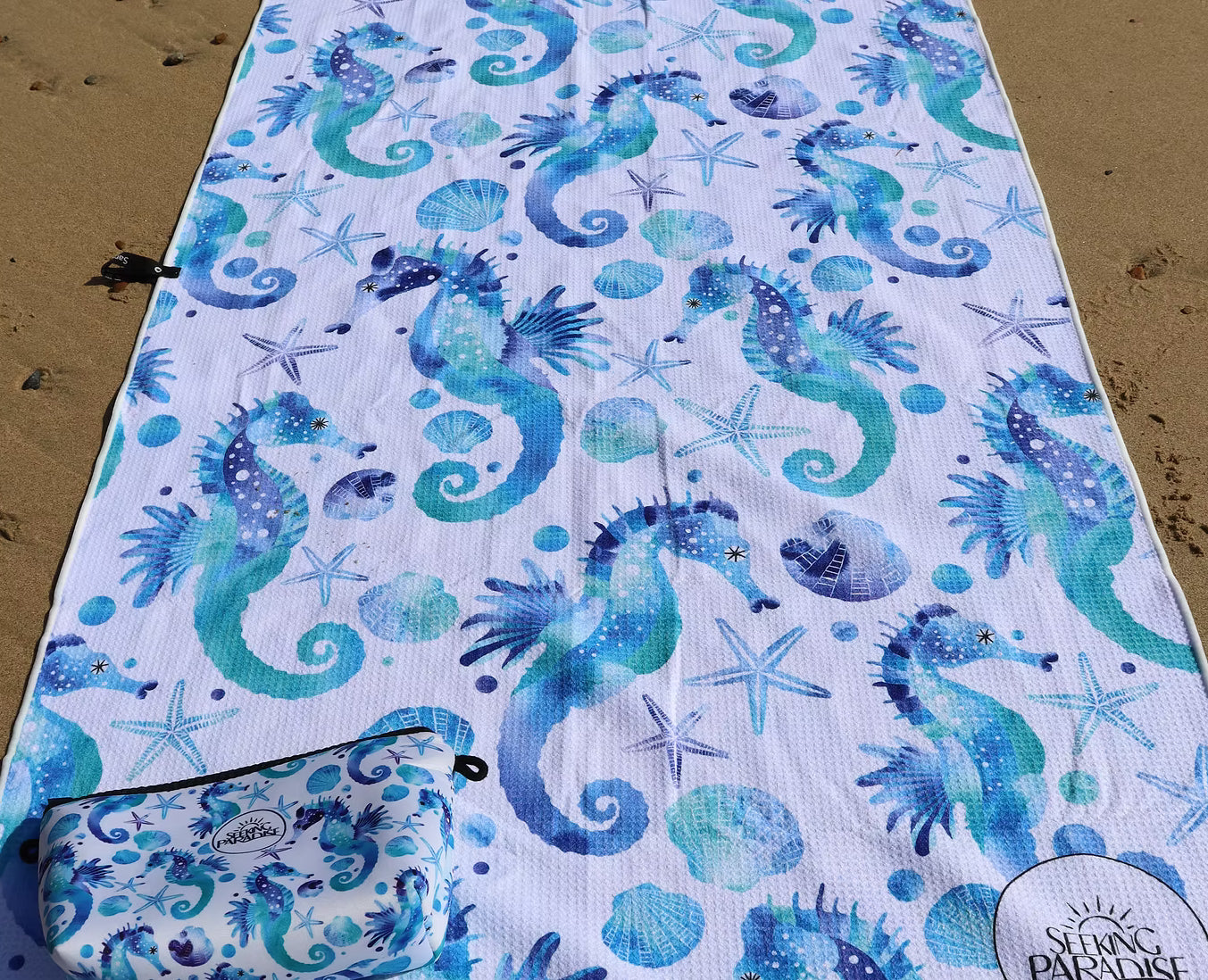 Our Seahorse microfibre towel is compact and lightweight, making if the perfect travel towel. These full size quick dry towels have a soft waffle texture that keeps your towel sand free.