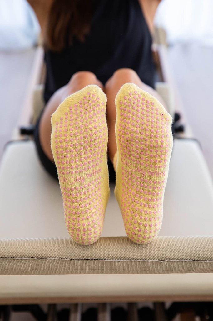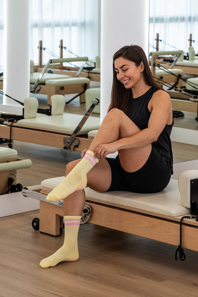 Brighten up your moves with these playful yellow grip socks, featuring a pink stripe that’s as fun as a surprise soirée. With a new improved style now featuring arch ribbing for extra stability and a thicker sole for enhanced comfort and durability. Not only do they look fabulous, but their grippy soles keep you stable on your mat or reformer, so you can master every pose with confidence.