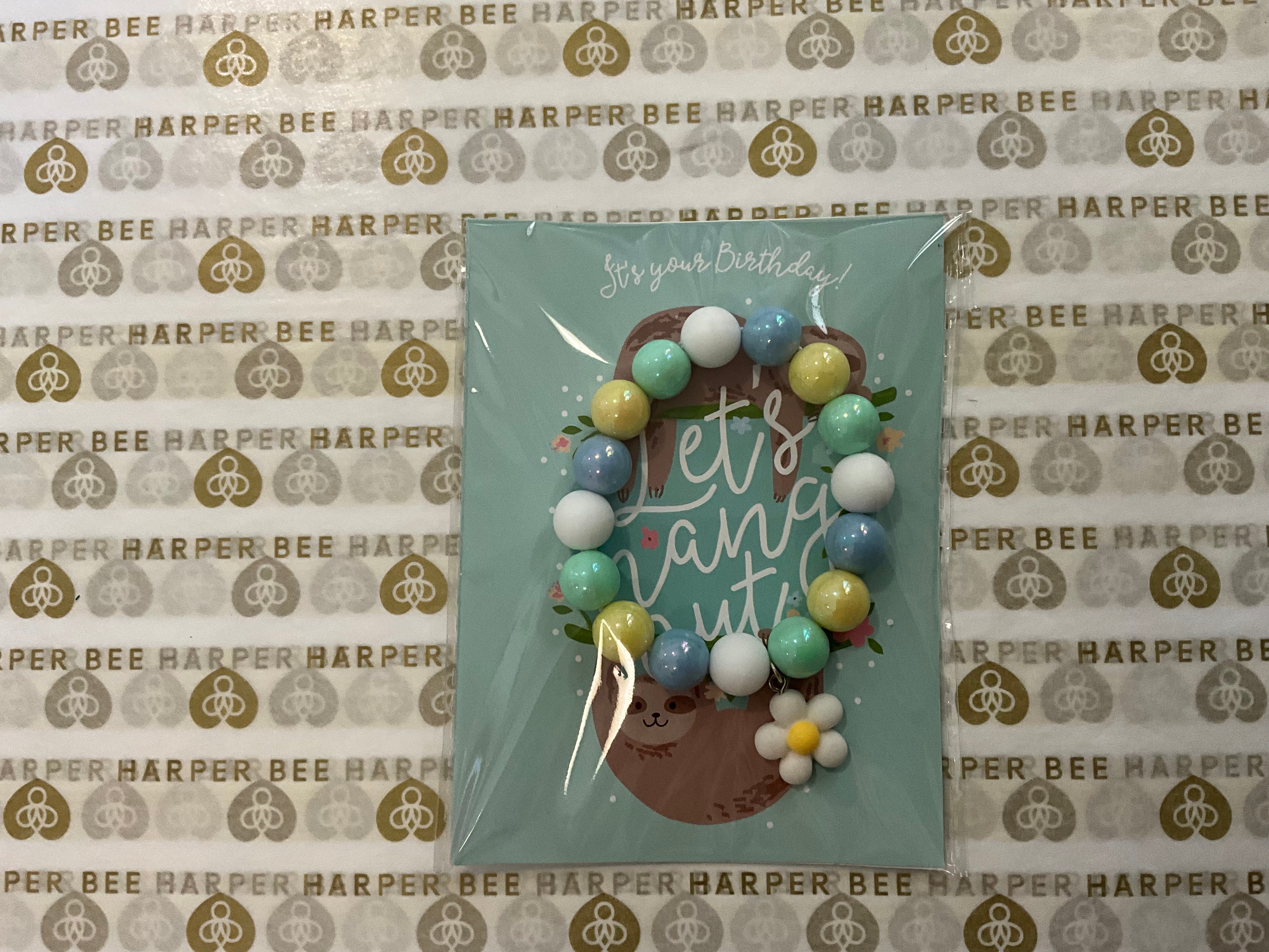 Harper Bee birthday card and bracelet pack, Sloth and flower theme.