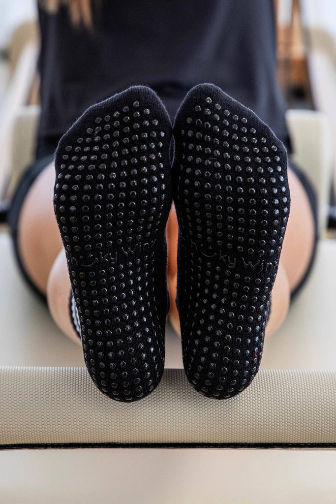Our black crew grip socks will make the perfect addition to your workout! With a new improved style featuring arch ribbing for extra stability and a thicker sole for enhanced comfort and durability. Not only do they look fabulous, but their grippy soles keep you stable on your mat or reformer, so you can master every pose with confidence.